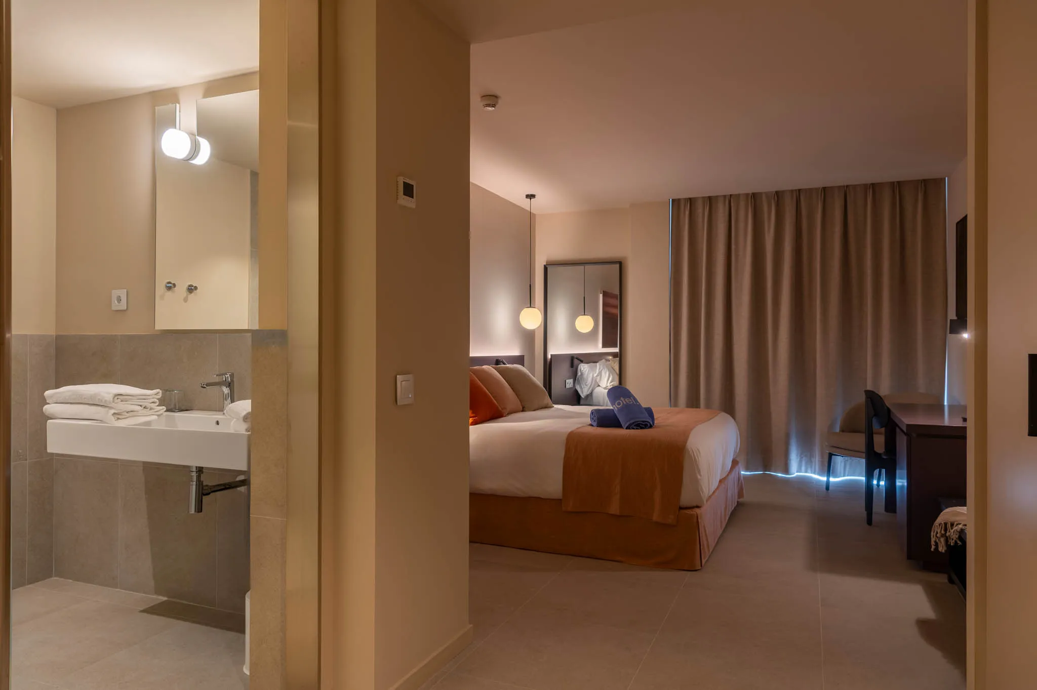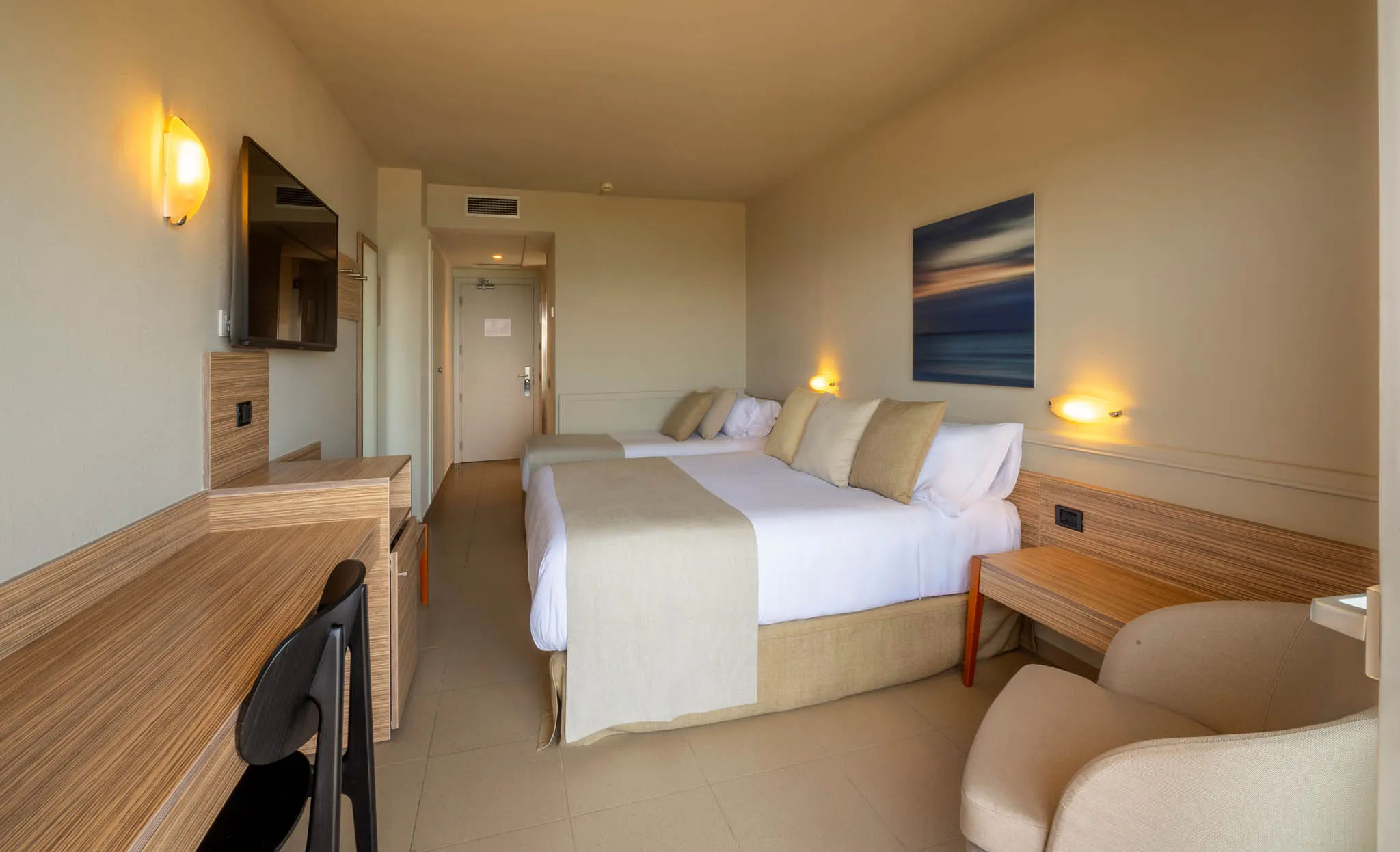 En AQUA Hotel Promenade & Spa, cada habitación ha sido diseñada para ofrecer el equilibrio perfecto entre estilo mediterráneo y confort. Sumérgete en un ambiente acogedor, con luz natural, tonos suaves y todo lo que necesitas para unas vacaciones inolvidables junto al mar.